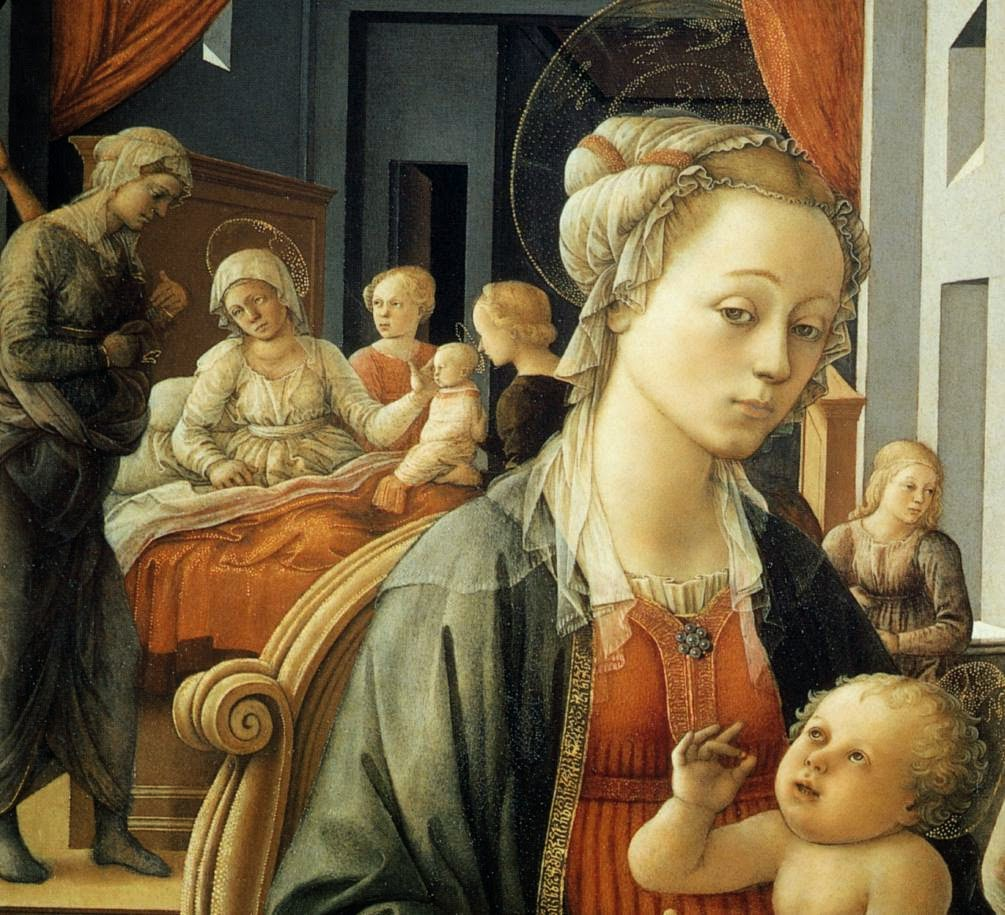 Madonna con Niño, entronizada, con guirnaldas, aúna la tradición flamenca, la gótica y la perspectiva toscana.